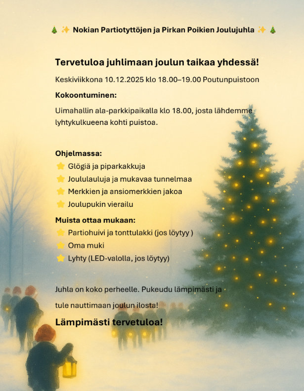 Ohjelmassa: Glögiä ja piparkakkuja, joululauluja, merkkien ja ansiomerkkien jakoa sekä Joulupukin vierailu! Ota mukaan partiohuivi, tonttulakki, oma muki ja lyhty (LED valo, jos löytyy).